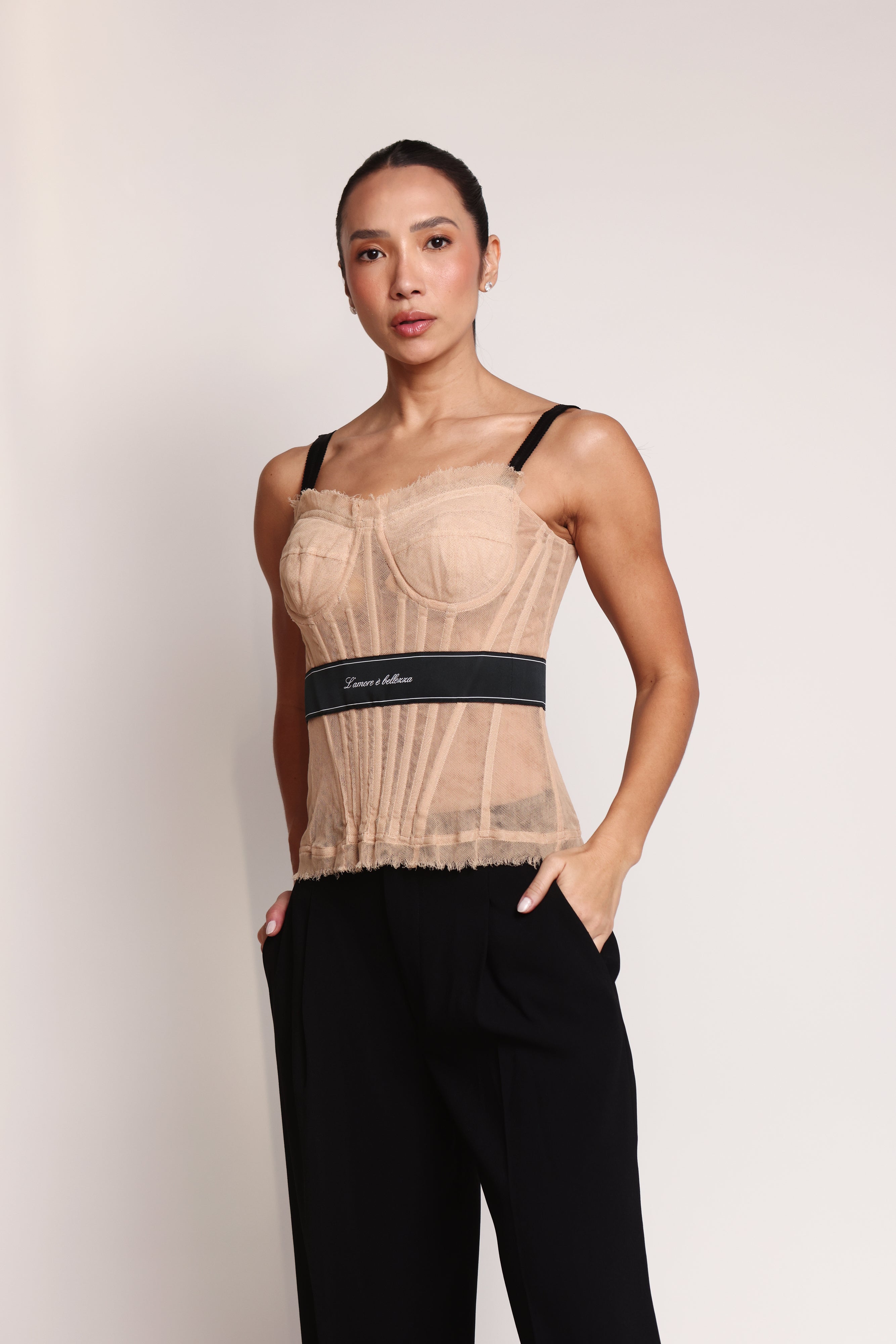 descrição: Top Corset Dolce & Gabbana Tule Bege/Preto. 44% poliéster 24% poliamida 22% elastano 10% poliéster.
