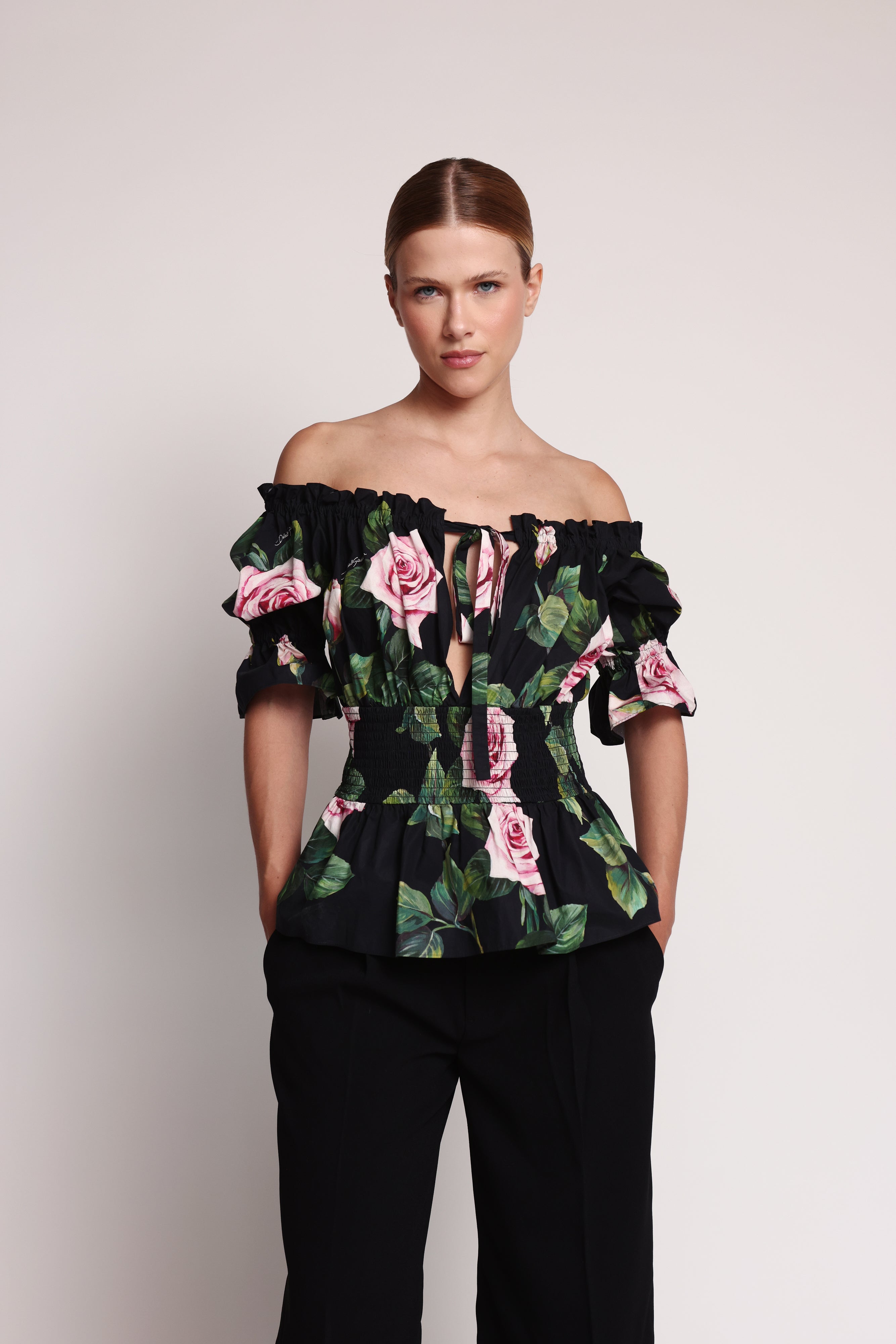 descrição: Ombros caídos. Feito de algodão poplin. Estampa floral.