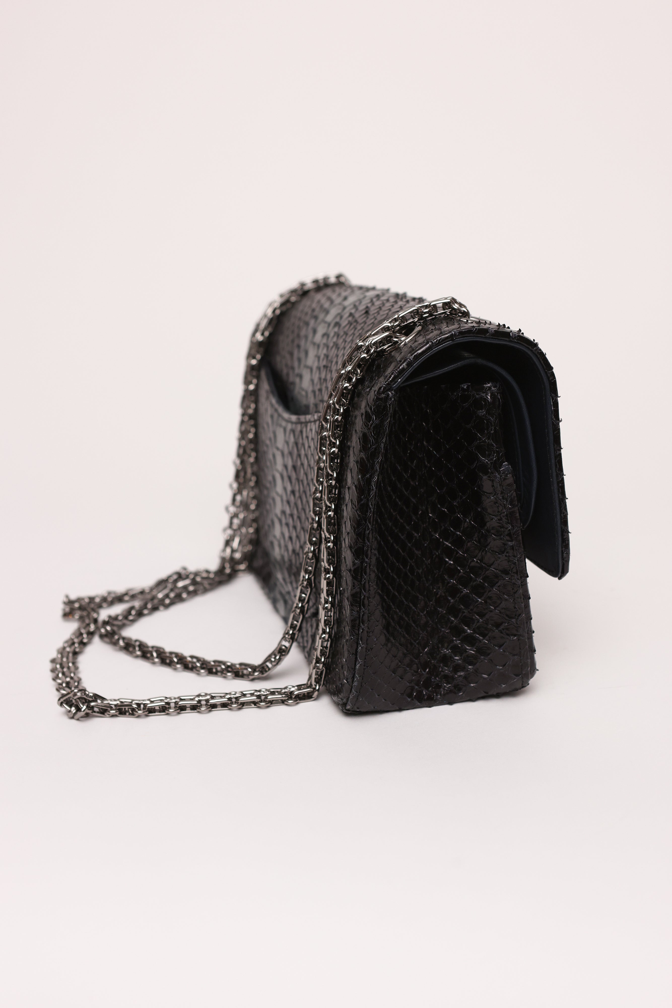 Descrição: Couro de Python na cor preto e cinza. Ferragens na cor prata.
