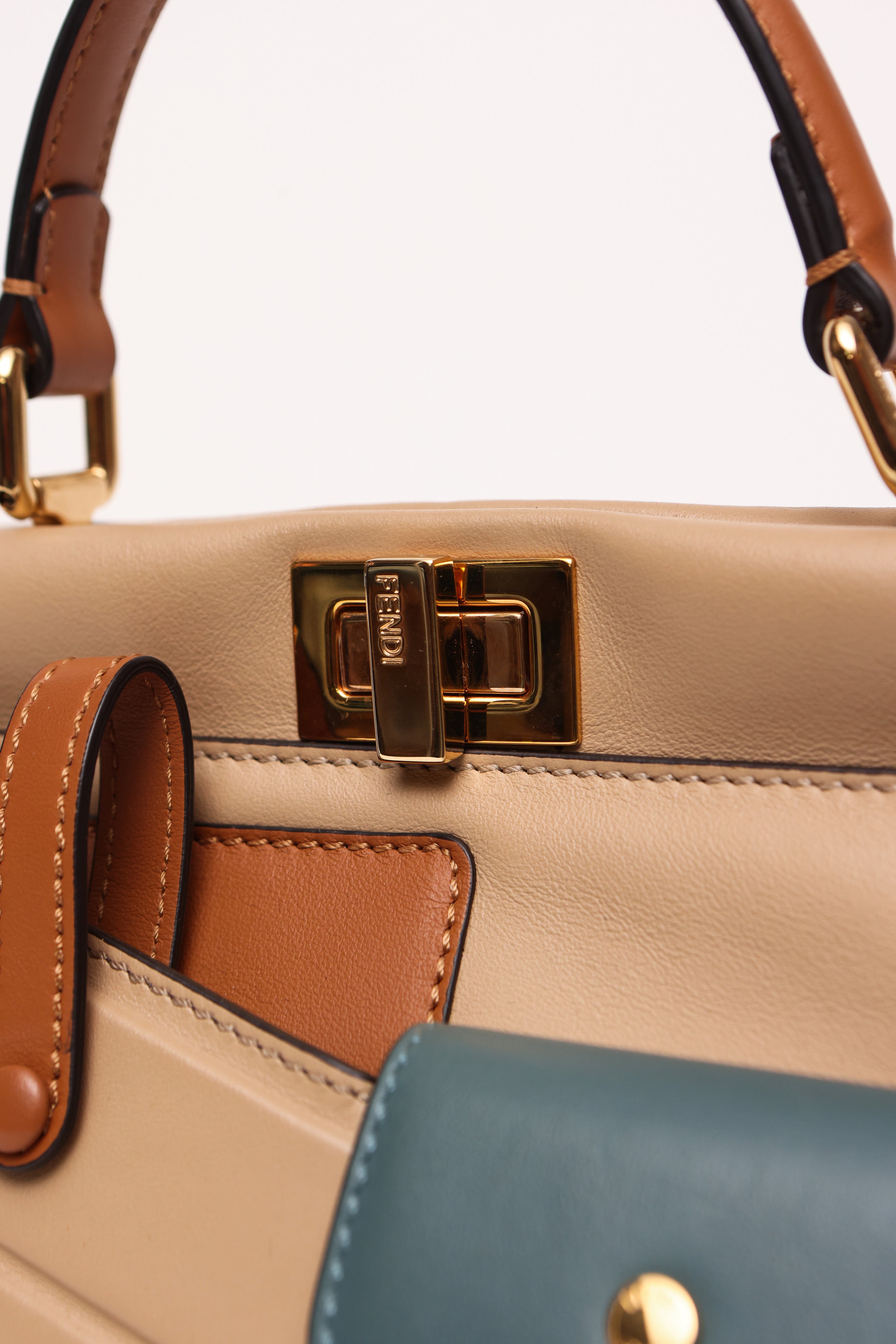 Descrição: Couro de bezerro, decorado com 3 bolsos exteriores em diferentes tamanhos, interior separado com 2 grandes compartimentos e bolso com zíper. Cor: Bege, Caramelo e Azul. Dimensões: L 27 x H 21 x D 11 cm.