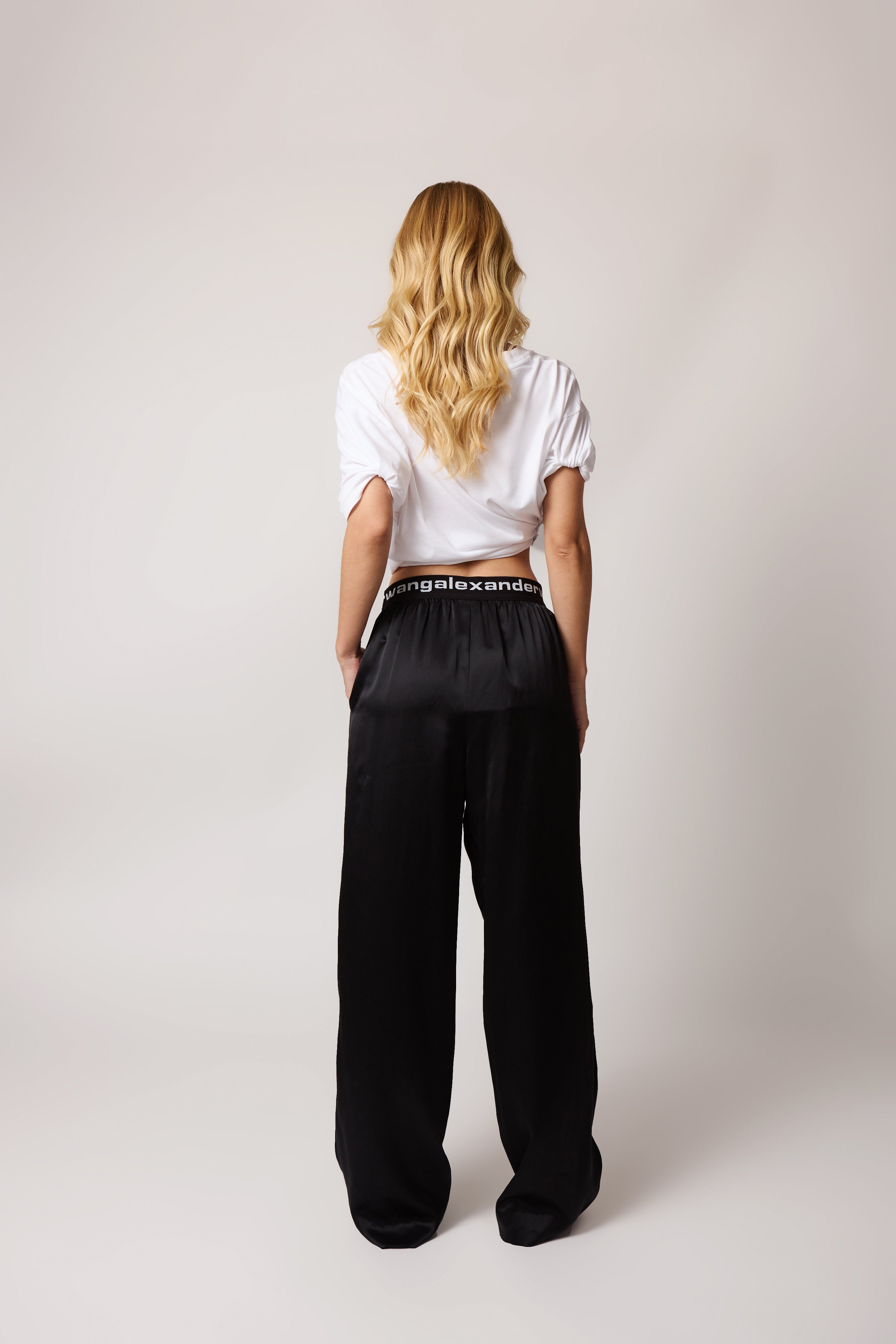 descrição: Calça Alexander Wang em tecido acetinado preto com caimento fluido e acabamento brilhante. Possui modelagem wide leg e cós elástico com o logo AlexanderWang em destaque, garantindo conforto e identidade moderna.