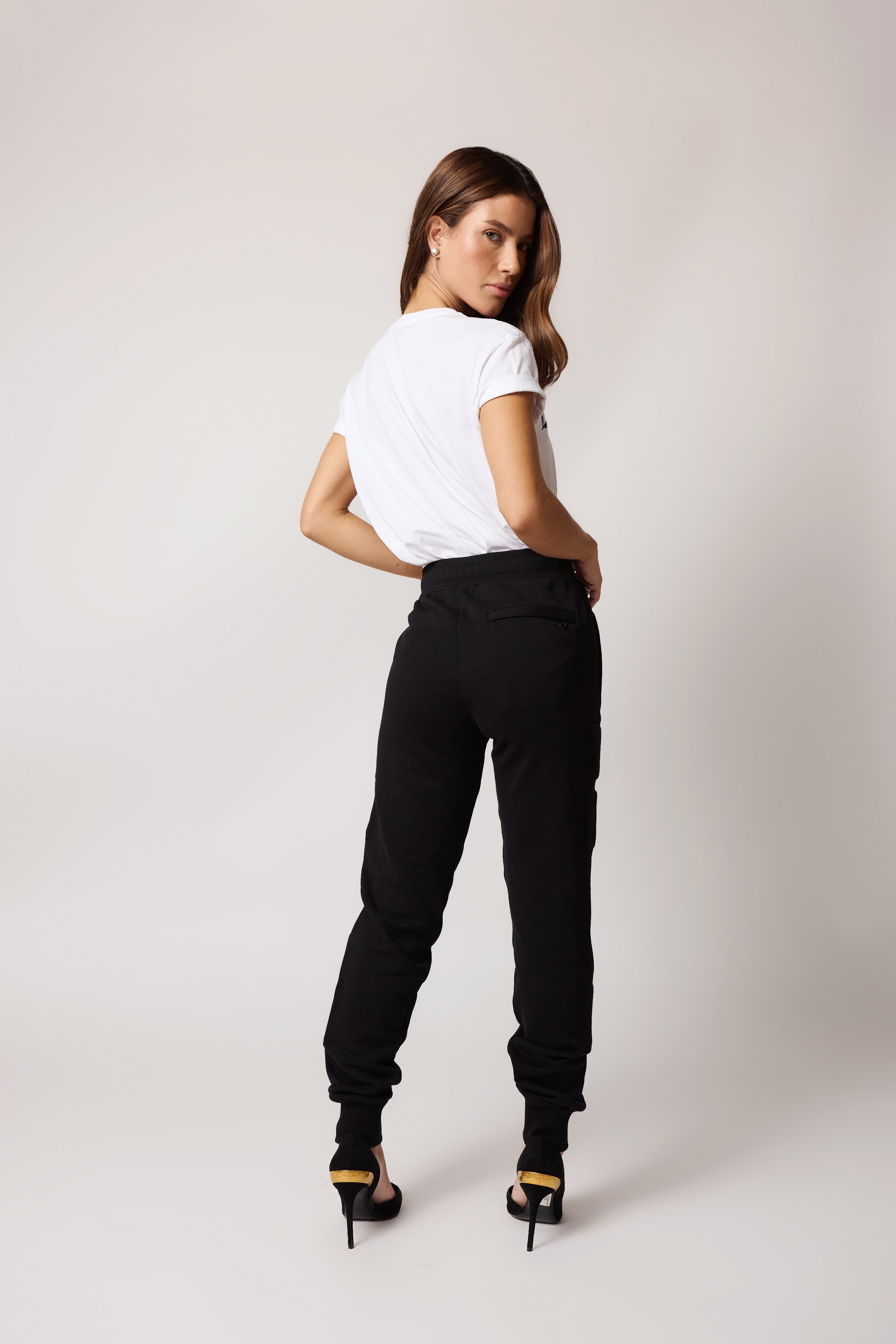 descrição: Calça jogging Dolce & Gabbana em moletom preto, com modelagem confortável e cós com ajuste por cordão. O destaque fica para o maxi logo “DOLCE & GABBANA” aplicado em relevo ao longo da perna, trazendo identidade marcante e estilosa. Possui bolsos laterais com zíper e punhos ajustados na barra, garantindo caimento moderno e sofisticado.