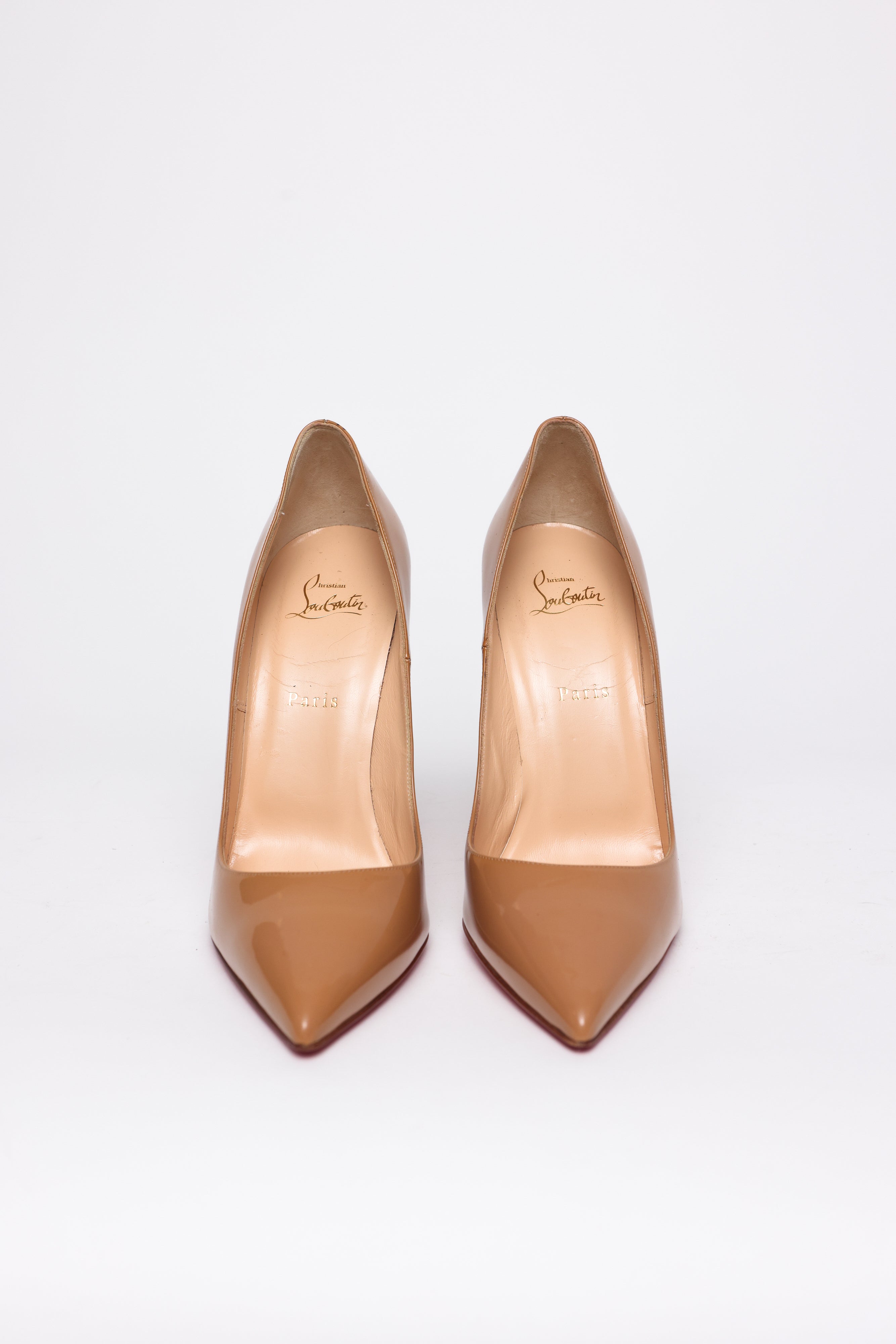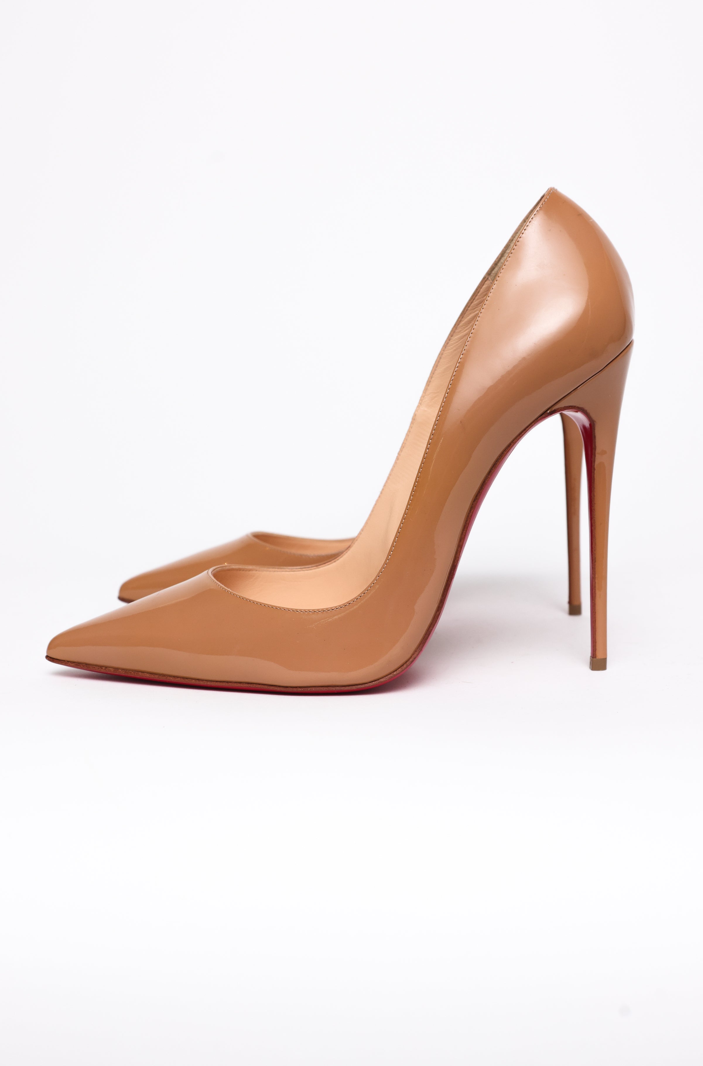 descrição: Scarpin em verniz nude, salto alto stiletto com bico fino