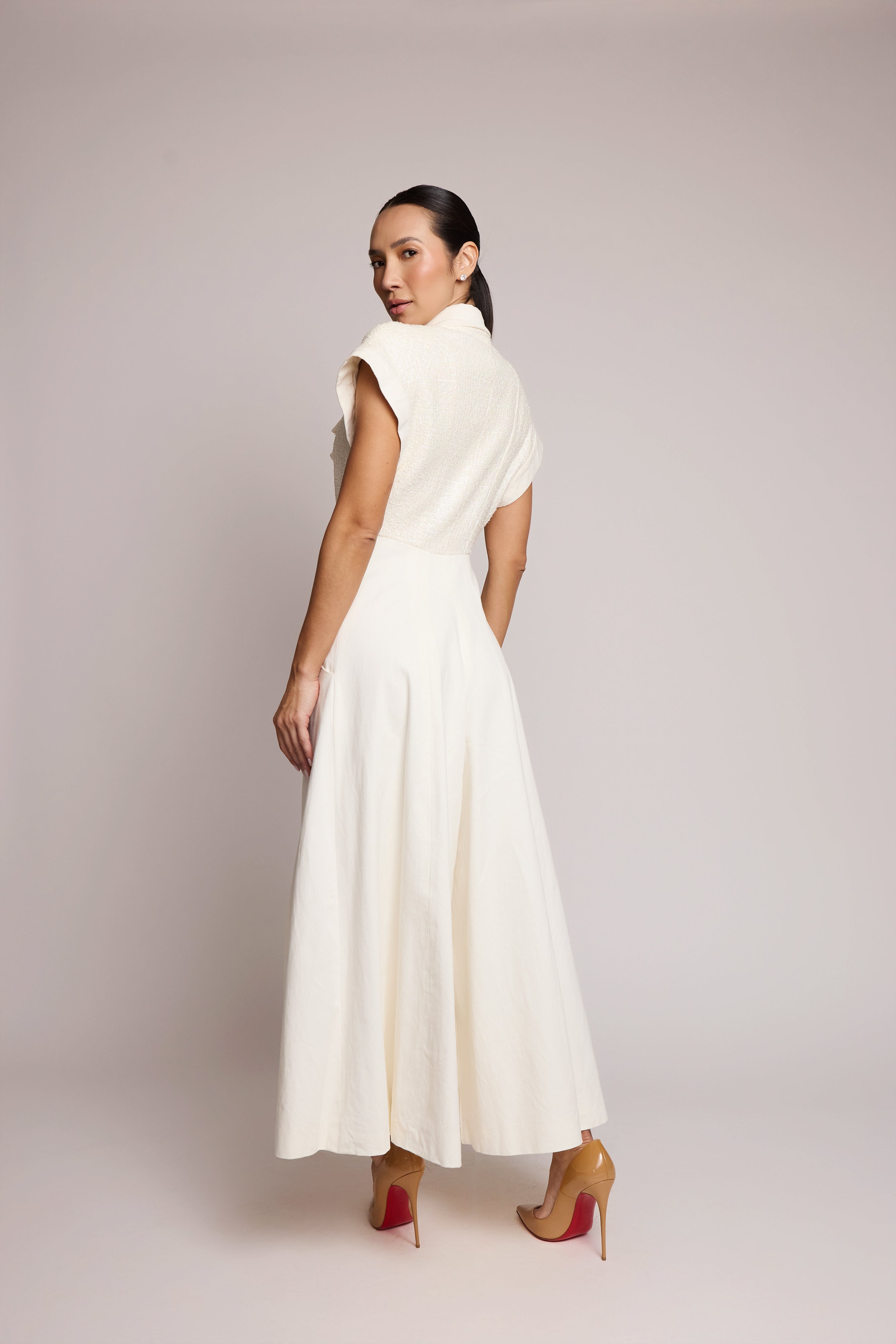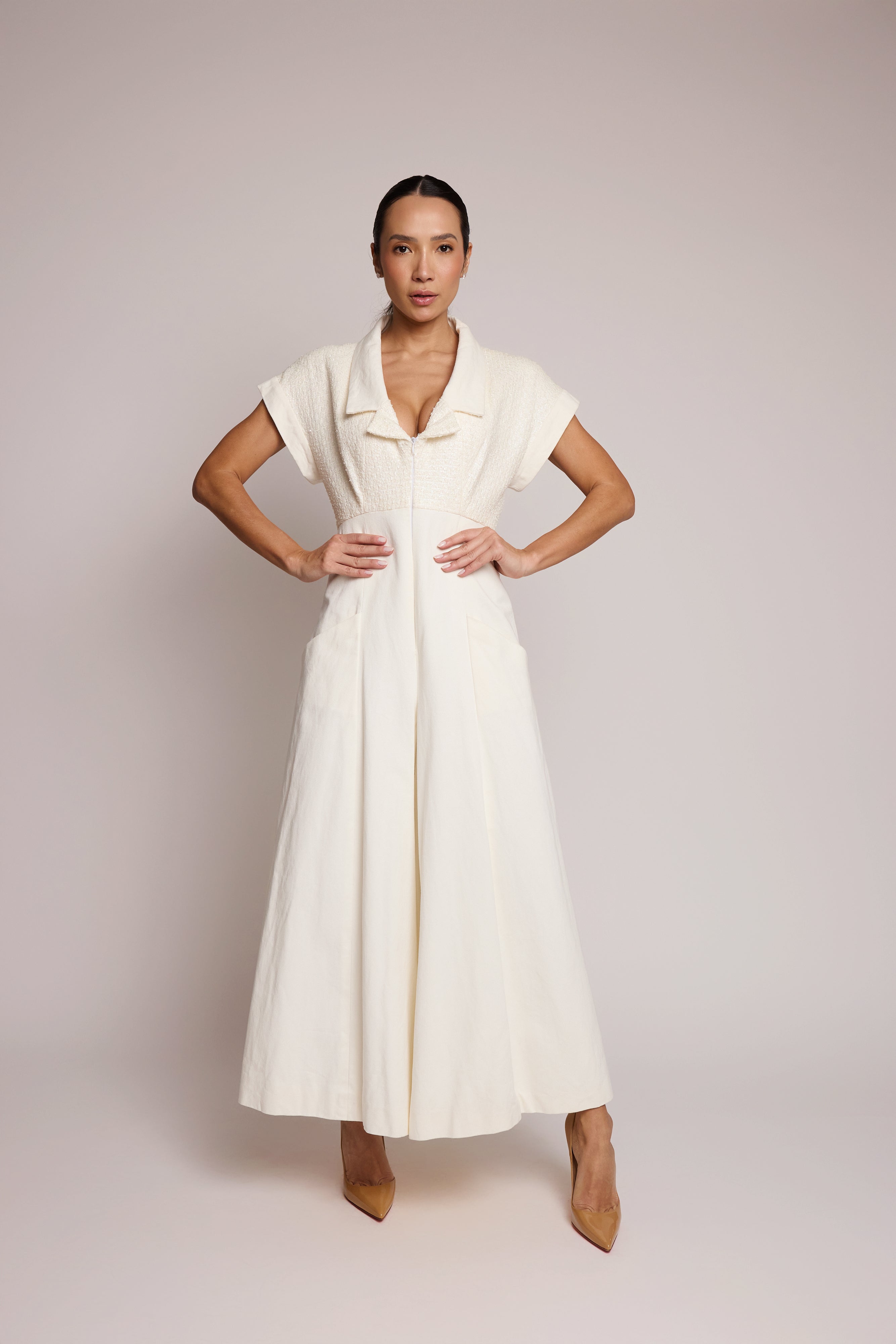descrição: Macacão Chanel em tom off-white, com corpo estruturado em tecido texturizado, gola ampla e zíper frontal. Possui mangas curtas, cintura marcada e pernas amplas que criam um caimento elegante e fluido. Uma peça refinada, com assinatura clássica da maison.