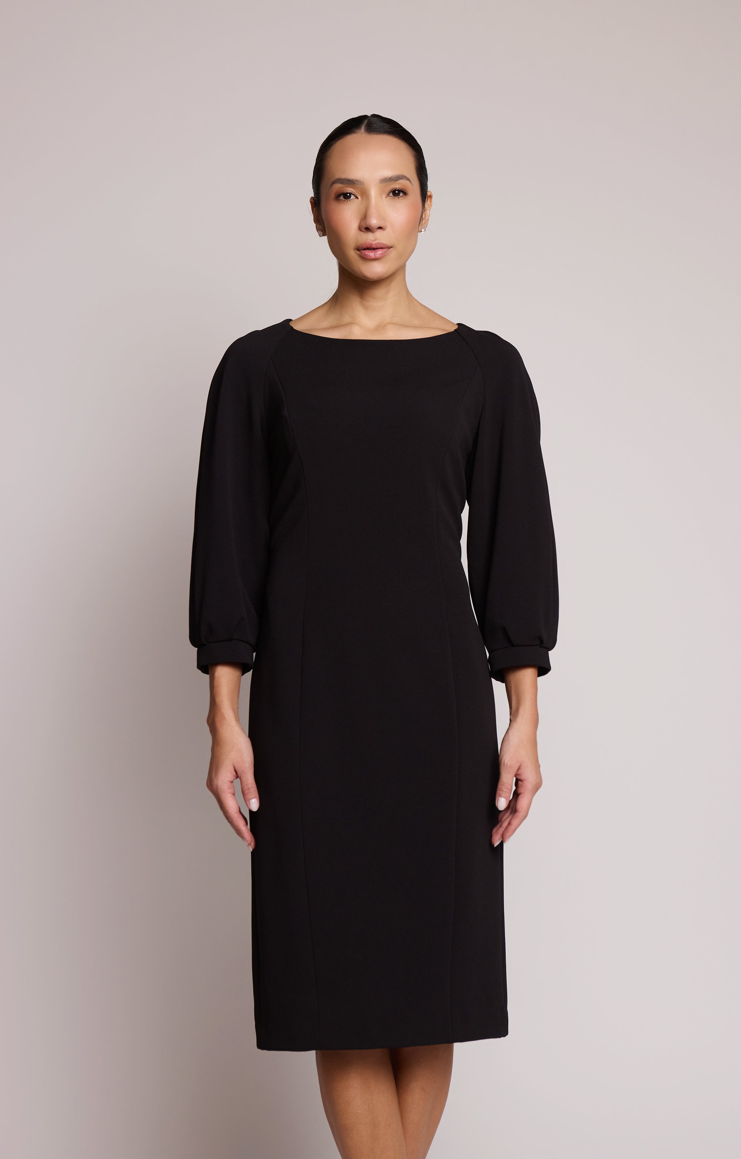 descrição: Vestido midi Badgley Mischka em modelagem evasê, confeccionado em tecido estruturado. O modelo apresenta decote redondo clássico, mangas três-quartos com volume suave e fechamento posterior por zíper oculto. Cor: Preto. Modelagem evasê. Decote redondo. Mangas 3/4. Fecho de zíper invisível nas costas.