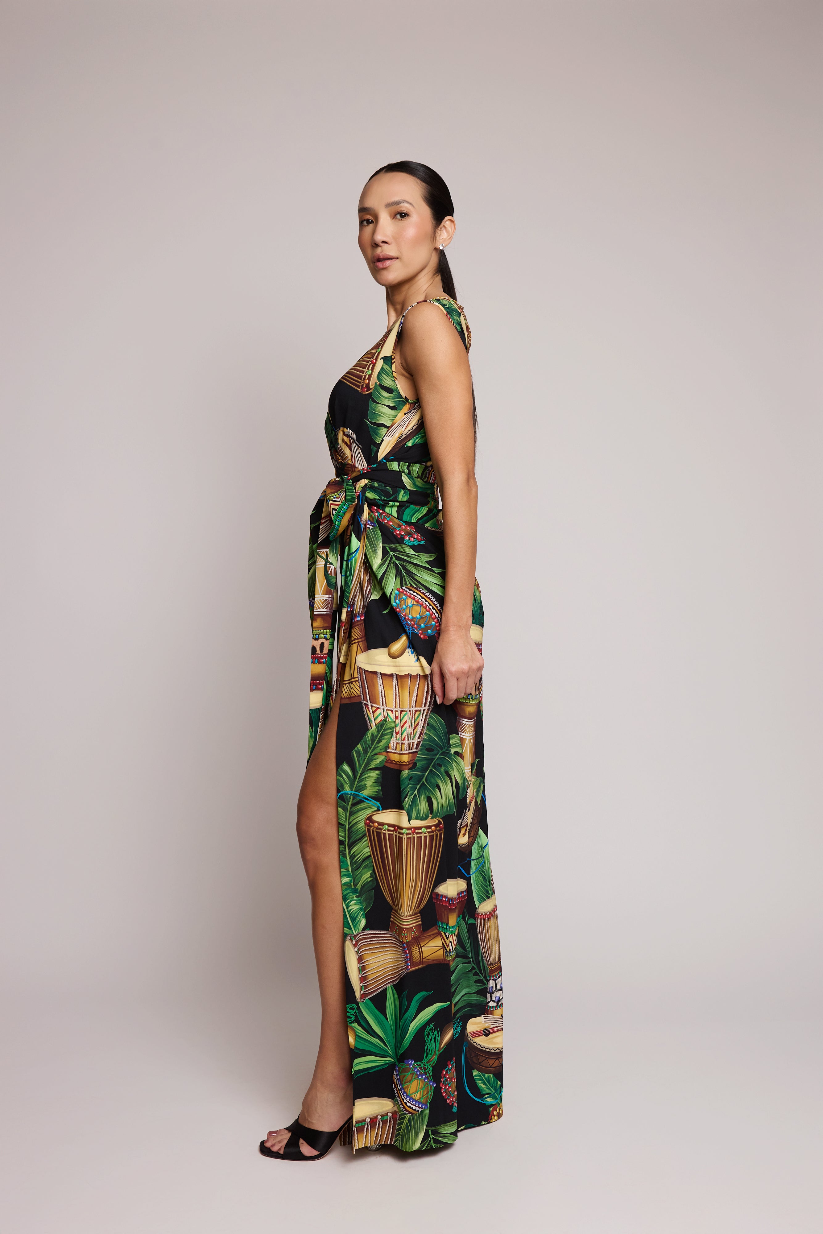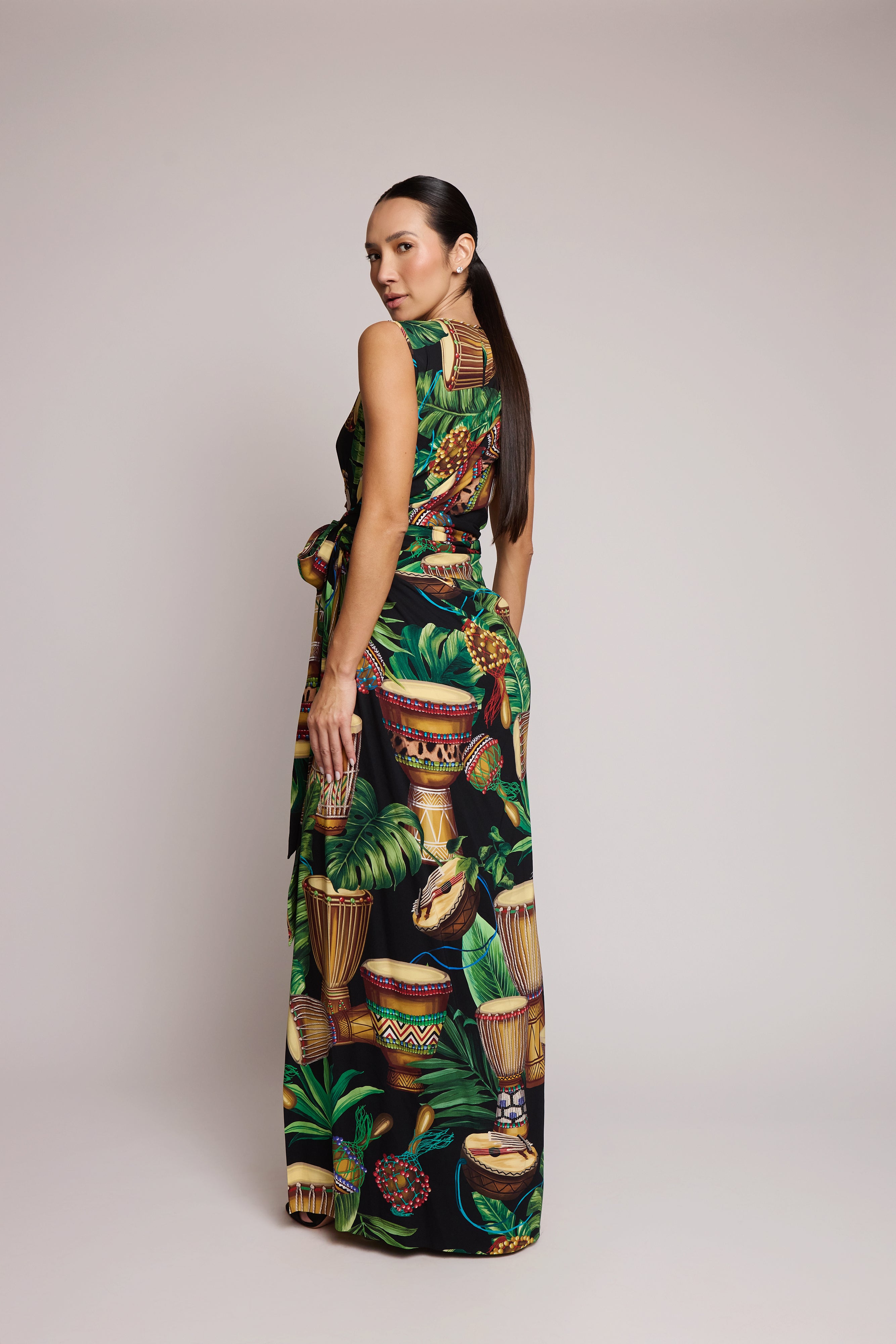 descrição: Vestido longo com amarração frontal e estampa de folhas, confeccionado em seda com elastano para um caimento leve e elegante. O modelo apresenta gola redonda, fechamento frontal por amarração, estrutura assimétrica e design sem mangas, destacando a fluidez e o movimento da peça.