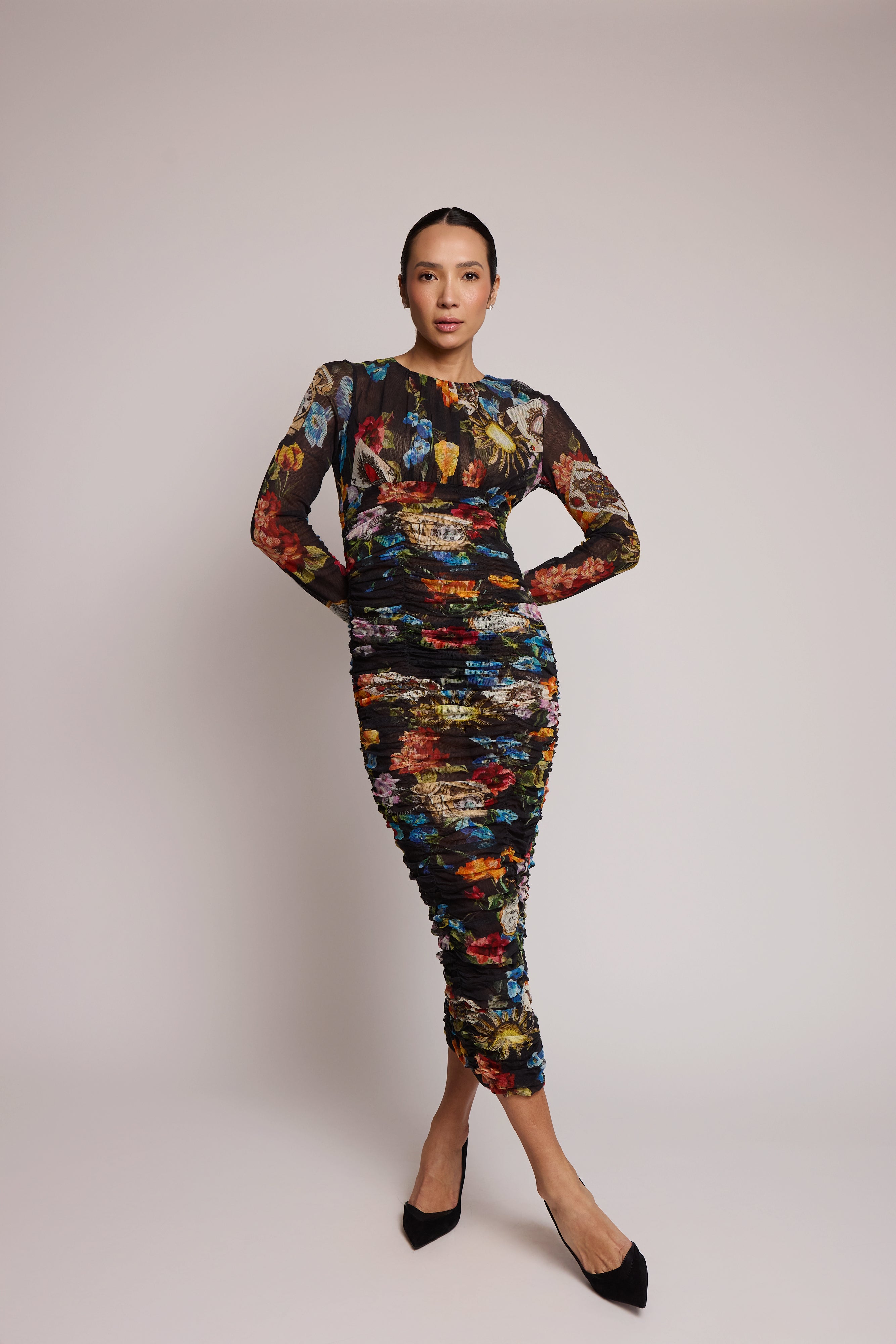 descrição: Vestido floral Dolce & Gabbana em malha de algodão com franzido, fechamento oculto por zíper e gancho nas costas, totalmente forrado, tecido elástico, tecido de peso médio. Lavagem a seco. Fabricado na Itália.