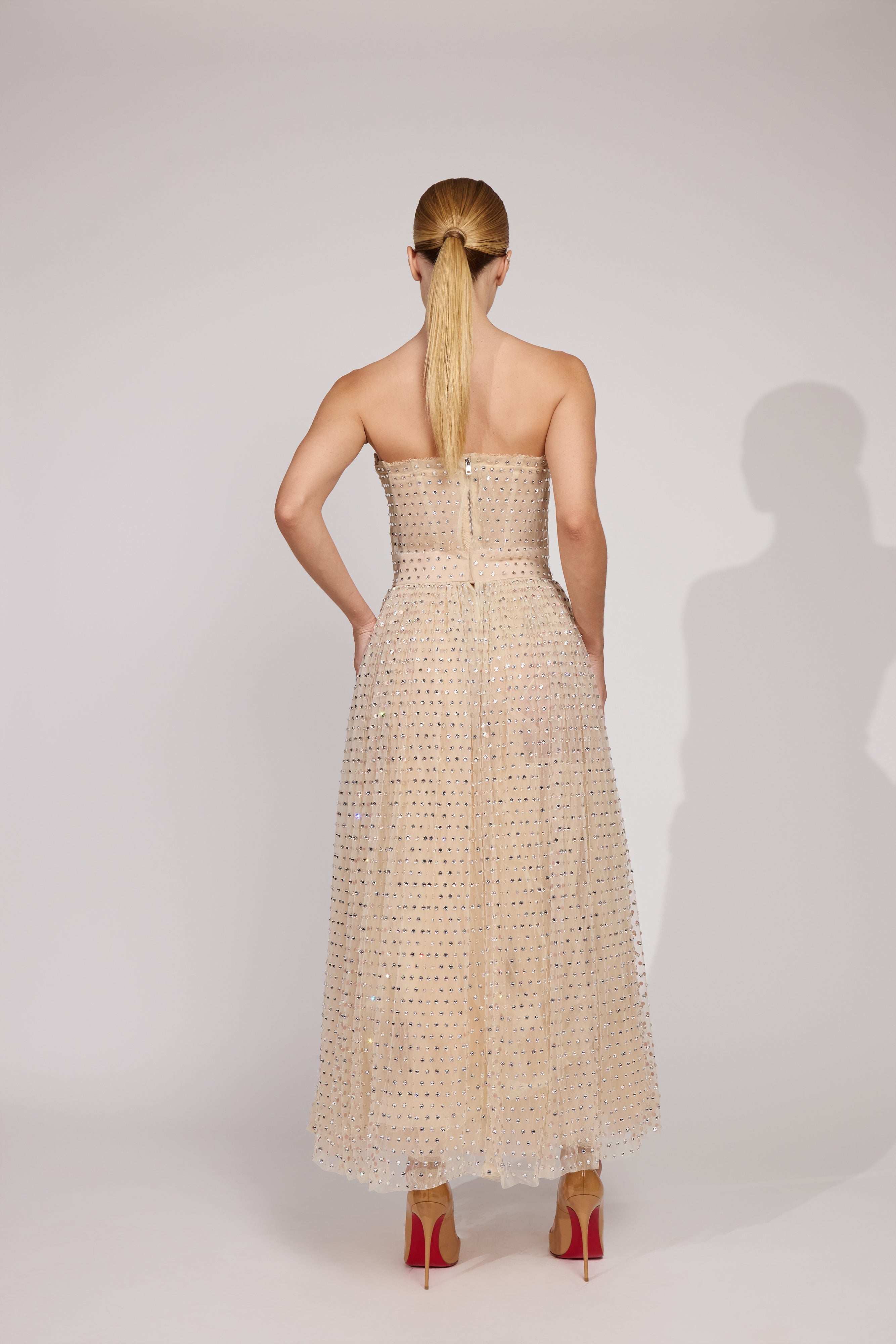 descrição: Vestido exclusivo Dolce & Gabbana em tule bege, totalmente adornado com cristais aplicados à mão. O modelo apresenta corpete estruturado estilo corset, que valoriza a silhueta com acabamento impecável e sustentação característica das peças de alta-costura da maison. A saia midi ampla traz movimento leve e brilho sofisticado, criando um efeito cintilante por toda a peça. Um vestido raro, artesanal e extremamente feminino, ideal para ocasiões especiais que pedem impacto, elegância e luxo absoluto. Cor: Bege. Detalhes: Cristais aplicados manualmente. Corset estruturado. Saia midi ampla