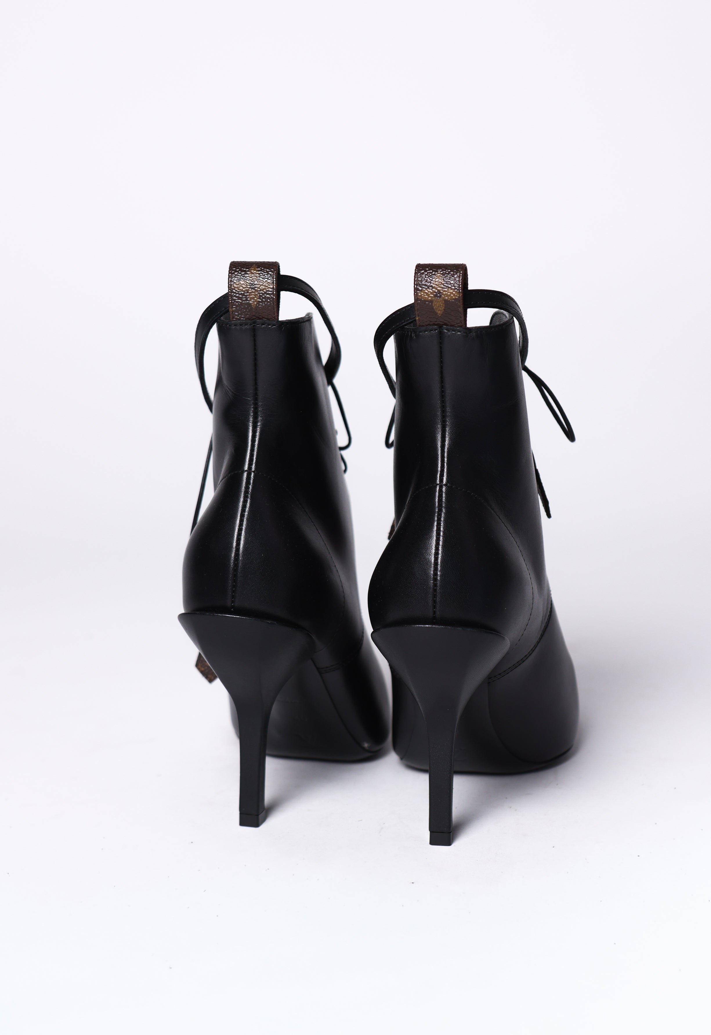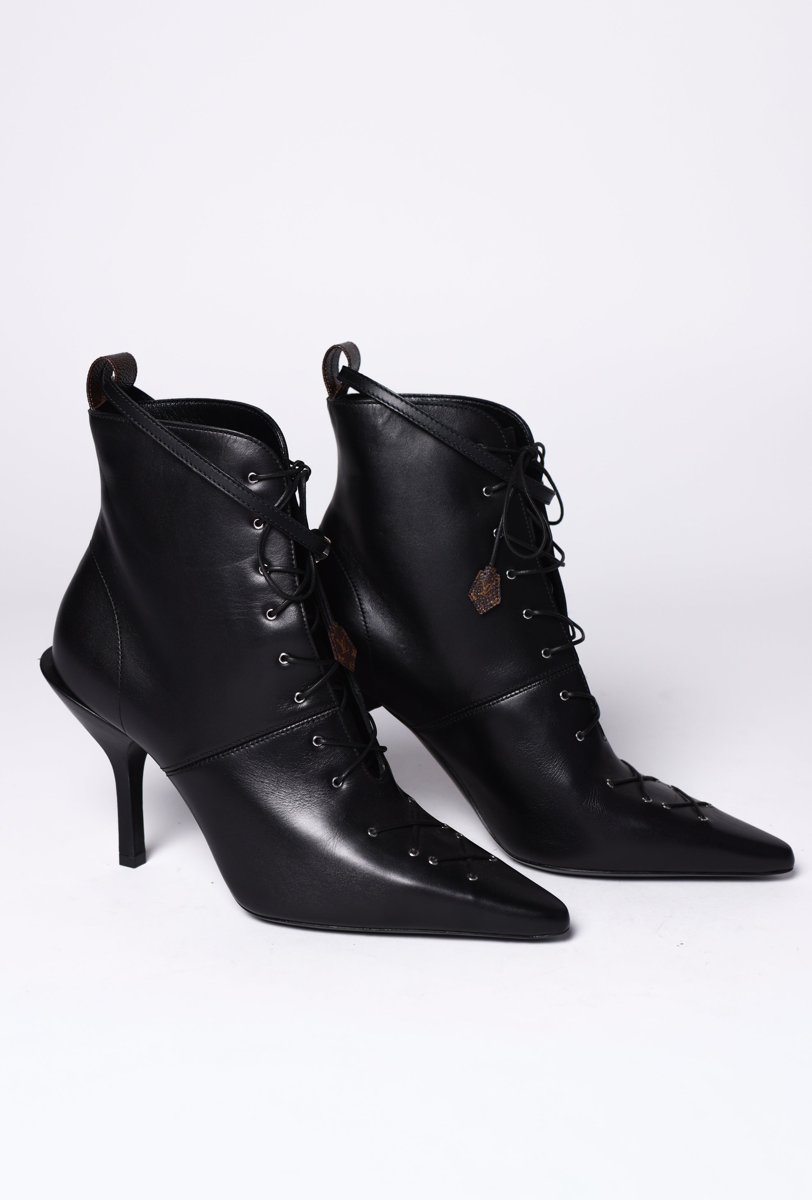 descrição: bota ankle boot Louis Vuitton preta com cadarços e salto agulha
