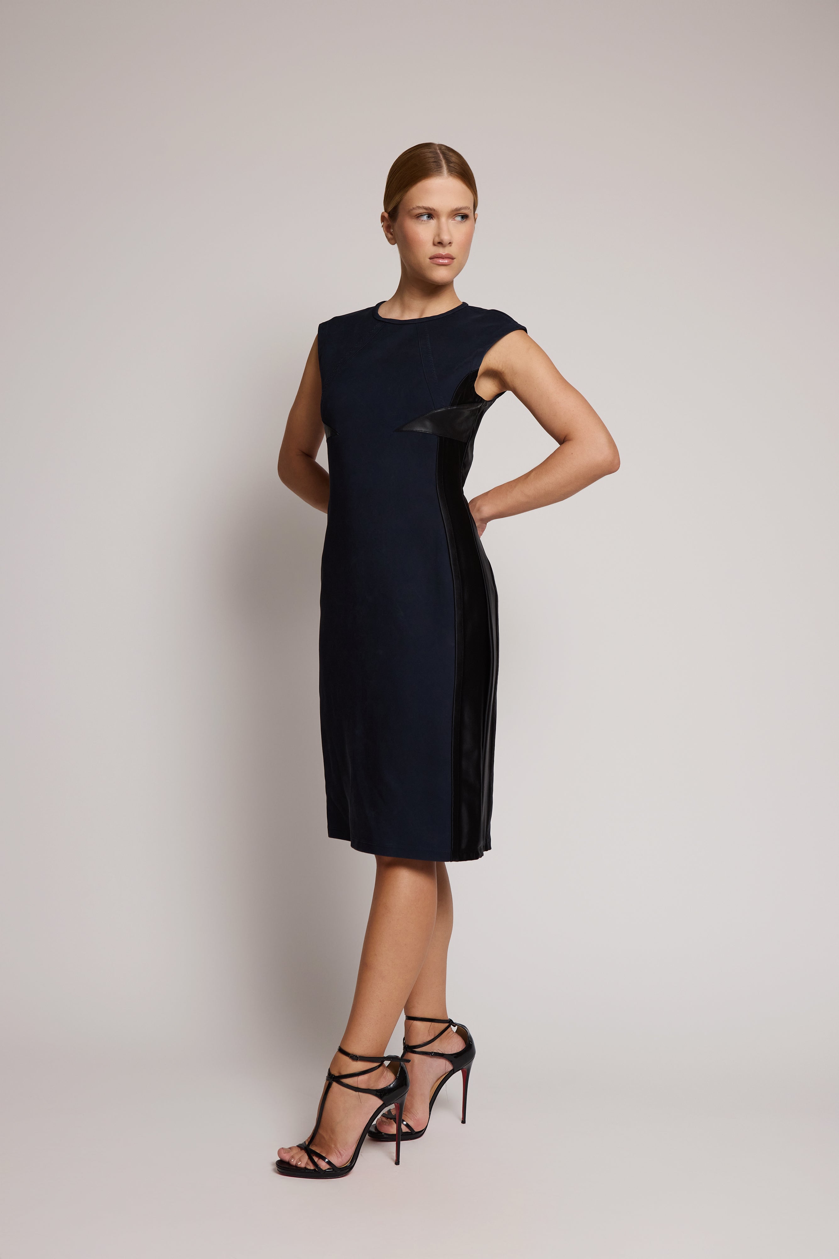 descrição: Vestido Louis Vuitton azul-marinho e preto, corte slim. Composição: 78% seda, 14% poliamida, 8% elastano.